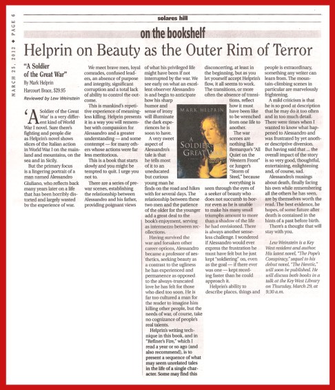 This is mankind’s repetitive experience of meaningless killing. Helprin presents it in a way you will remember with compassion for Alessandro and a greater understanding and some contempt for many others whose actions were far less meritorious.